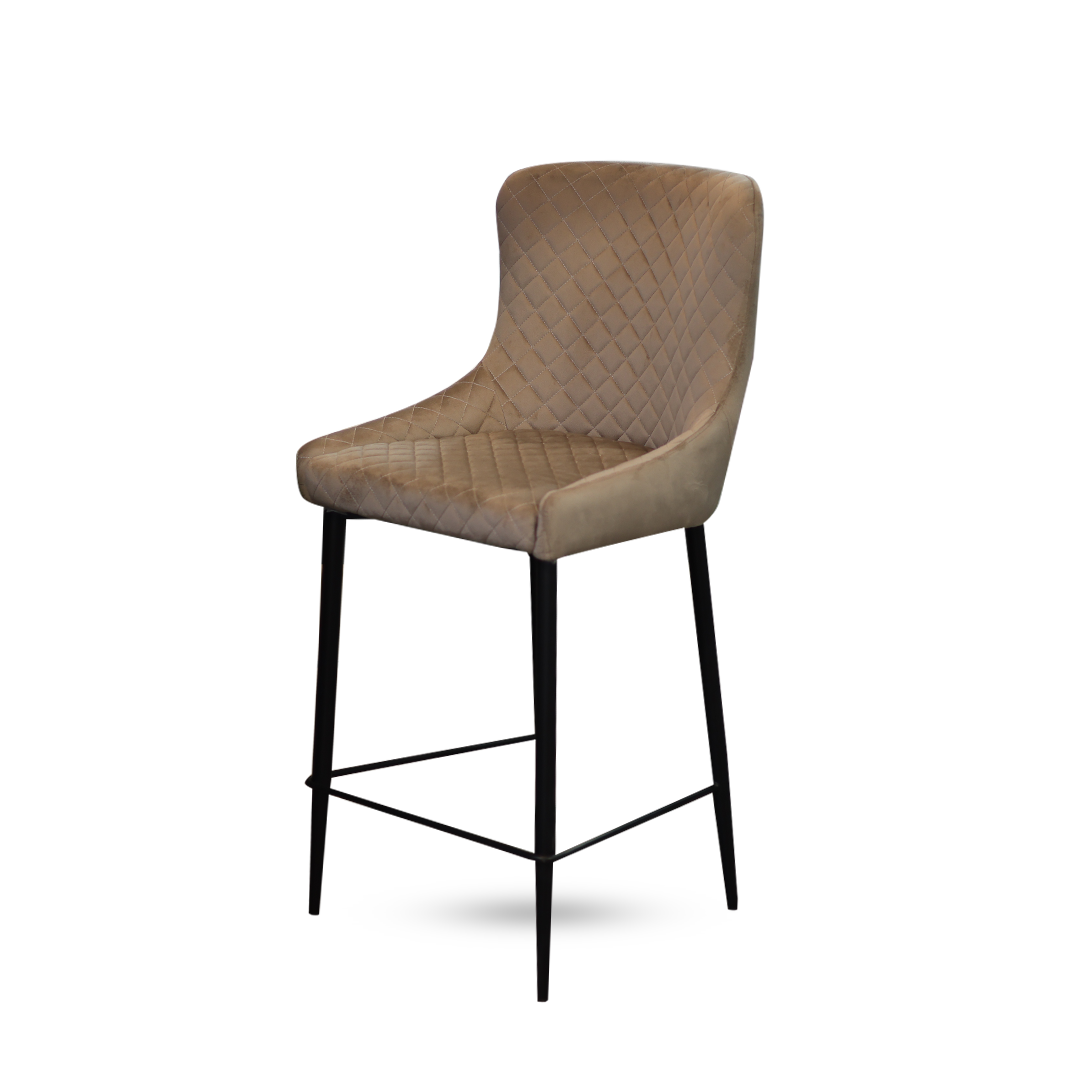 כיסא בר מודרני עם ריפוד קטיפתי ותפירת יהלום, בעיצוב נוח ויוקרתי עם רגלי מתכת שחורות יציבות.