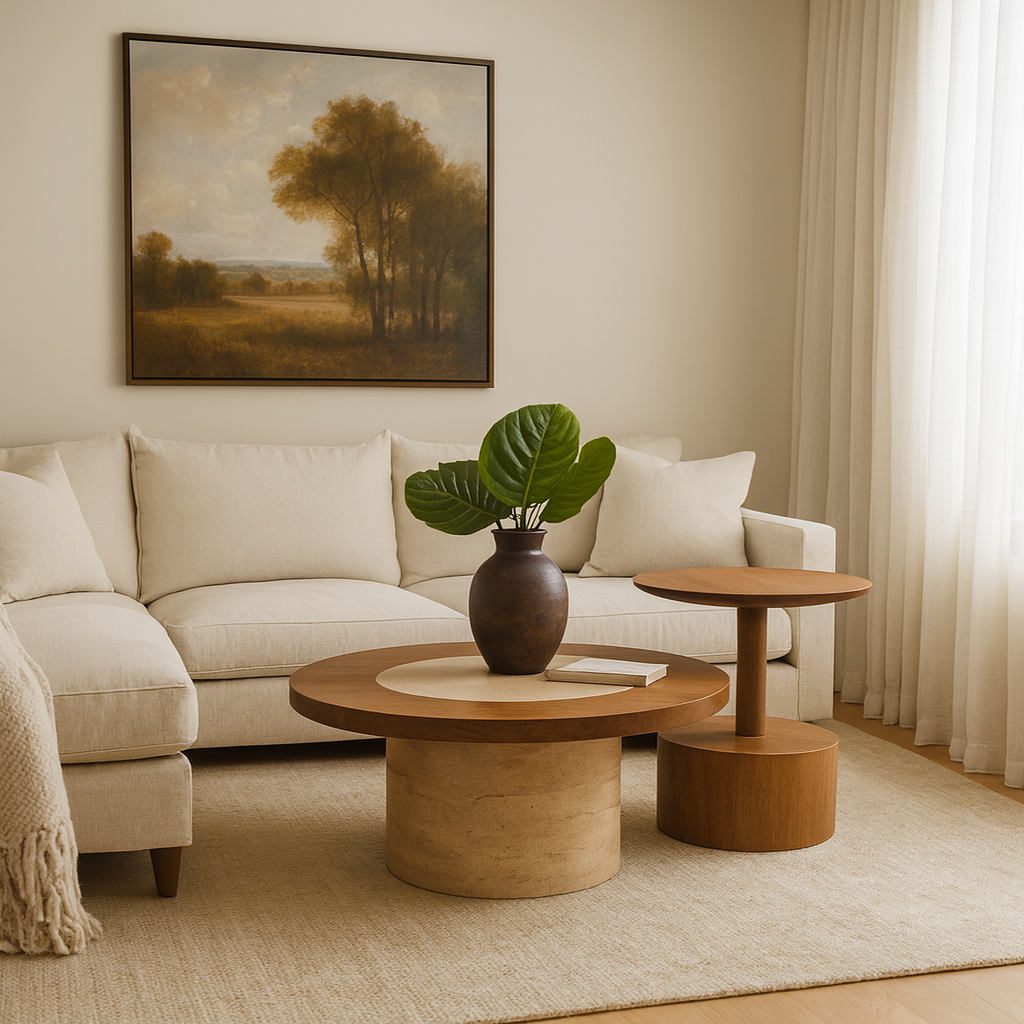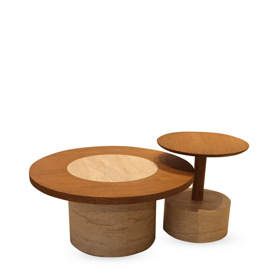 שולחן קפה ייחודי המשלב עיצוב מודרני. משטח עץ עגול בשילוב אבן יוקרתי, מונח על בסיס גלילי אבן – מעניקים תחושת יציבות, אלגנטיות ונוכחות מרשימה בסלון.