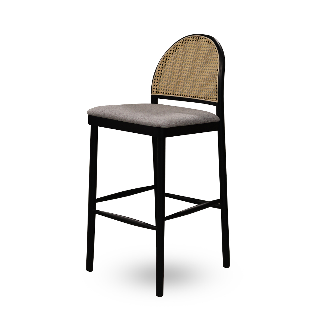 כיסא בר אלגנטי עם שלדת מתכת שחורה, מושב מרופד בבד נוח ומשענת גב קלועה בסגנון ראטן טבעי. שילוב מושלם של חמימות טבעית עם קווים מודרניים – מתאים למטבחים ואיים בעיצוב עדכני.