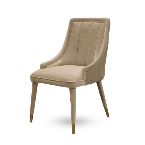 כיסא מעוצב בסגנון יוקרתי עם גב גבוה ותפירות אנכיות המוסיפות אלגנטיות. מושב מרופד לנוחות מירבית ורגלי מתכת דקות עם קצה מוזהב למראה מעודן ואלגנטי. מתאים לפינת אוכל, חדר ישיבות או חלל אירוח מעוצב.