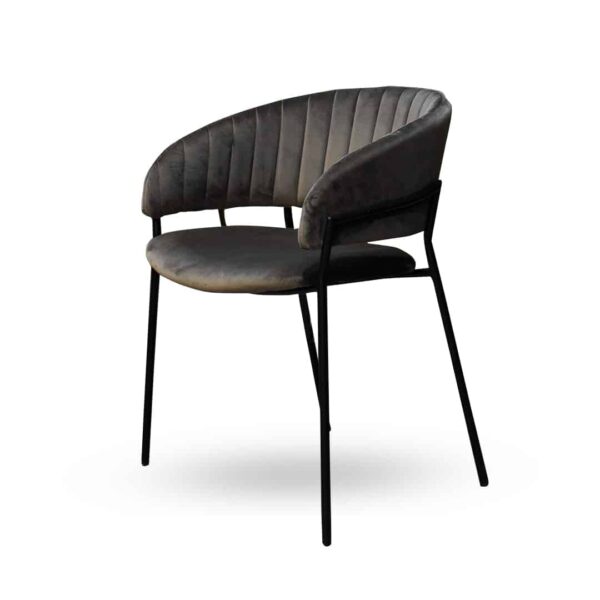 כיסא אוכל בעיצוב עכשווי עם ריפוד קטיפתי בגוון אפור כהה למראה יוקרתי ונעים.