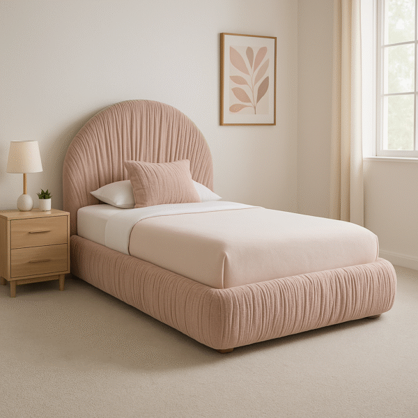 מיטת נוער בעיצוב יוצא דופן ואלגנטי, עם ראש מיטה גבוה ועגול בעל ריפוד מקומט המעניק מראה רך וייחודי. בסיס המיטה מרופד באותו סגנון בד עשיר, למראה אחיד ועוטף. . מתאימה במיוחד לנערות המחפשות שילוב בין נוחות לעיצוב ייחודי עם טאץ' רך ונשי.