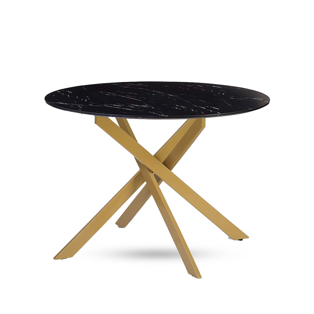 שולחן אוכל מודרני ואלגנטי עם משטח שיש שחור יוקרתי ורגלי מתכת מוזהבות בעיצוב מוצלב.