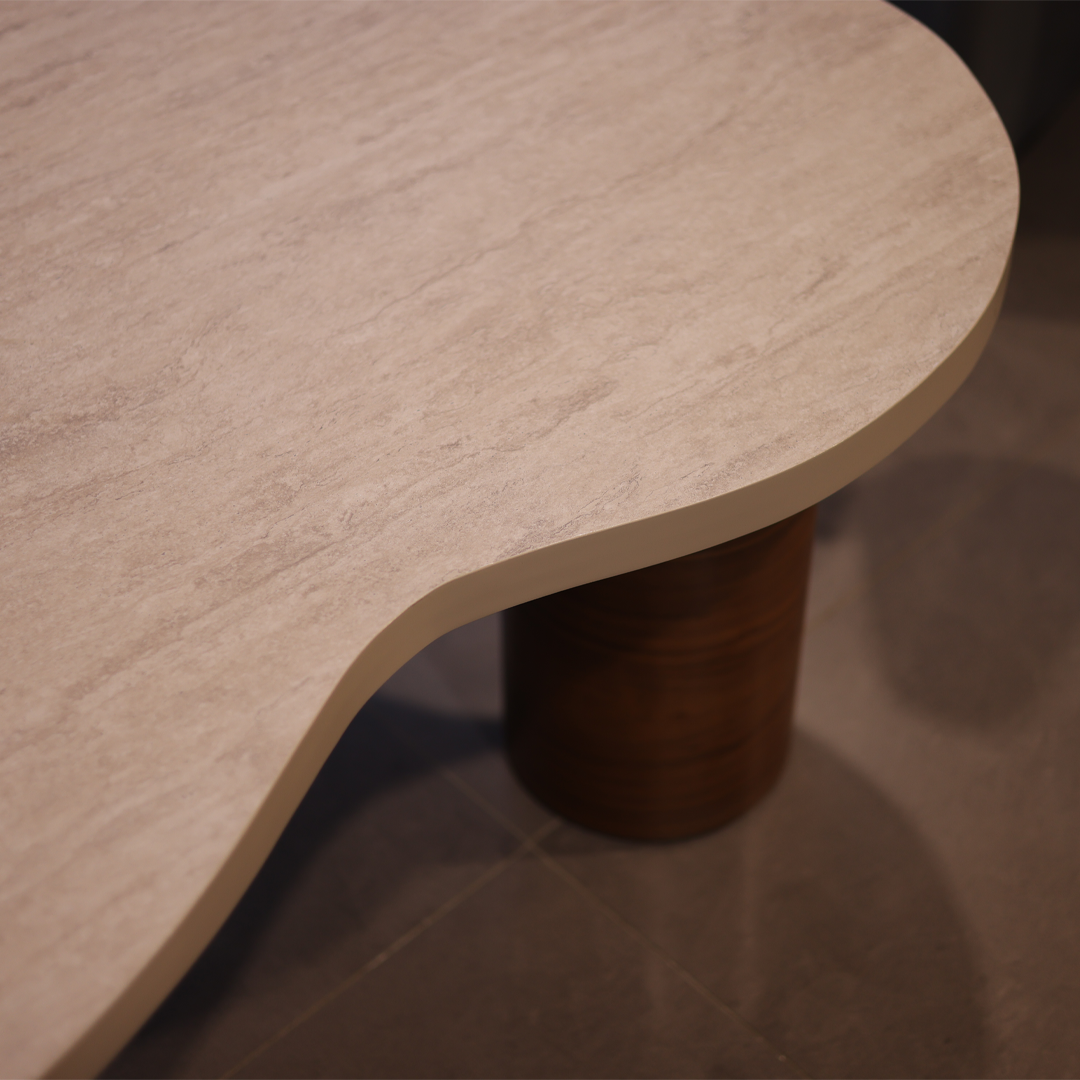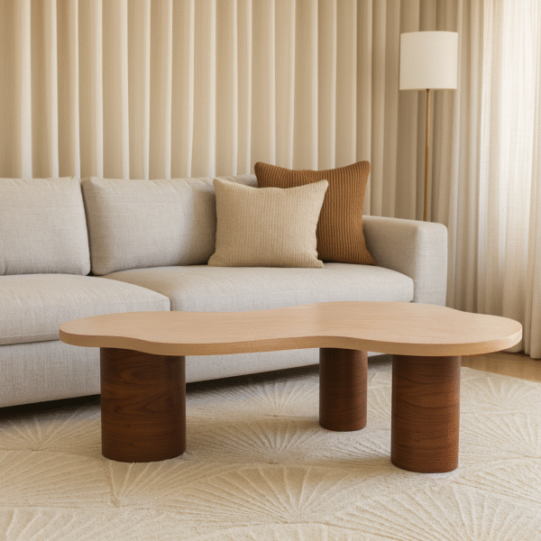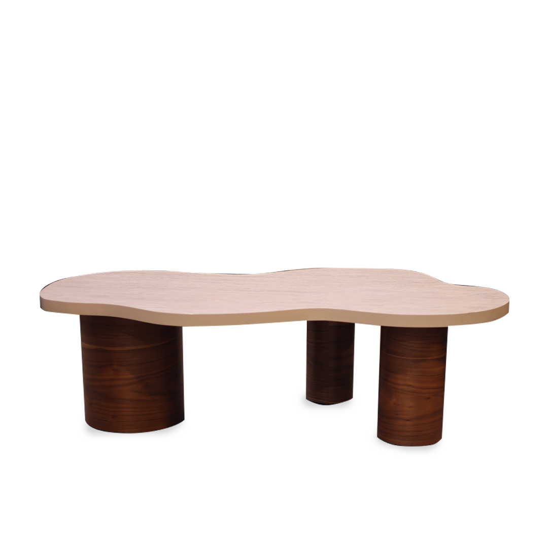 שולחן קפה ייחודי עם פלטה בעלת קווים אורגניים מדמה צורת ענן ורגליים גליליות מעץ כהה. משלב בין מראה טבעי וחם לבין עיצוב מודרני ונקי. מתאים למרכז הסלון ליצירת אווירה מעוצבת ואלגנטית.