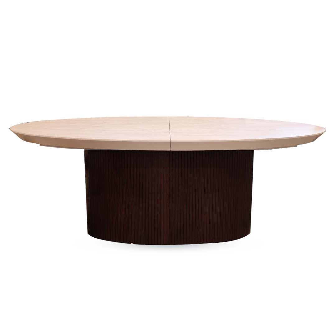 שולחן אוכל אובלי בעיצוב מודרני ויוקרתי, שמשלב בין מראה חמים ונעים לבין קווים אלגנטיים ונקיים