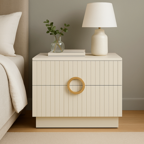 שידת לילה יוקרתית עם חריצים אנכיים מעודנים ועיצוב סימטרי קלאסי. הידית העגולה בגוון זהב מוסיפה נגיעה אלגנטית וייחודית, ומשתלבת בהרמוניה עם הקווים הנקיים של השידה. כוללת שתי מגירות נוחות לאחסון פרקטי של חפצים אישיים. מושלמת להשלמת מראה מוקפד בחדר שינה מעוצב.